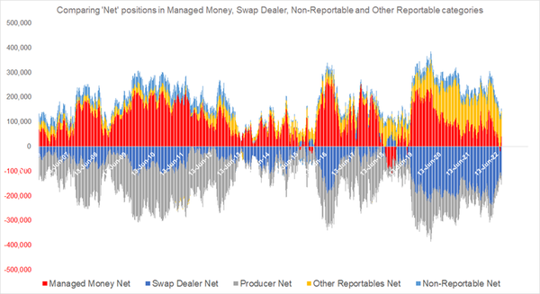 Comparing ‘Net’ positions of Swap Dealers, Managed Money investors, Producers, Other and Non-Reportable categories.