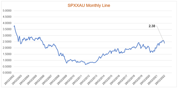 The S&P 500 to gold ratio is currently at its highest level since 2005. Today, it would take 2.38 troy ounces of gold to buy one ‘share’ in the S&P 500, giving the impression that gold is relatively cheap compared to US equities.