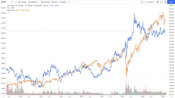 US dollar gold price (blue) compared to S&P 500 (orange)