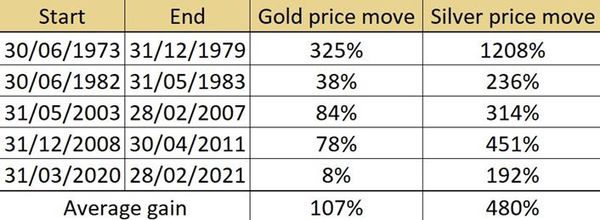 This can be seen in the table below, which highlights five of the biggest bull market runs for silver since the 1970s.